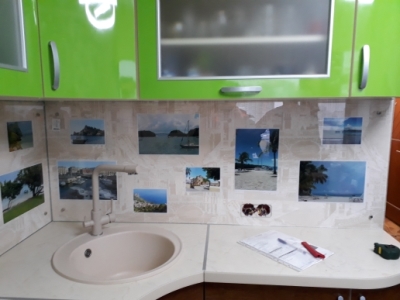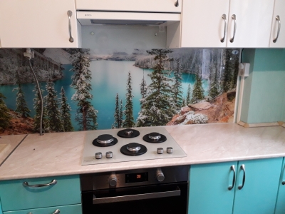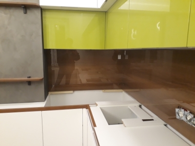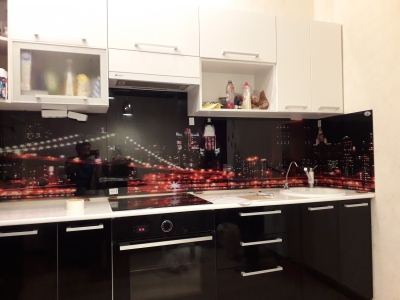 С помощью стеклянных фасадов для кухонной мебели можно создать интерьерное взаимодействие напольных и навесных конструкций: - нижний блок зрительно утяжеляется глубокими цветами (помещение вытягивается по вертикали); - одно изображение композиционно разбивается на фартук и фасады (кухня централизуется вокруг рабочей зоны); - повторяющийся узор наносится на шкафы (комната становится шире и ярче).