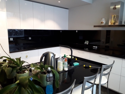 Мебельные фасады из стекла помогают оформить кухню в единой стилистике благодаря однотонному окрашиванию или УФ-печати. Краска наносится на обратную сторону панели ровным слоем (доступно 2 000 оттенков и авторских макетов). Детализированное изображение печатается на стекле с фотографической точностью.